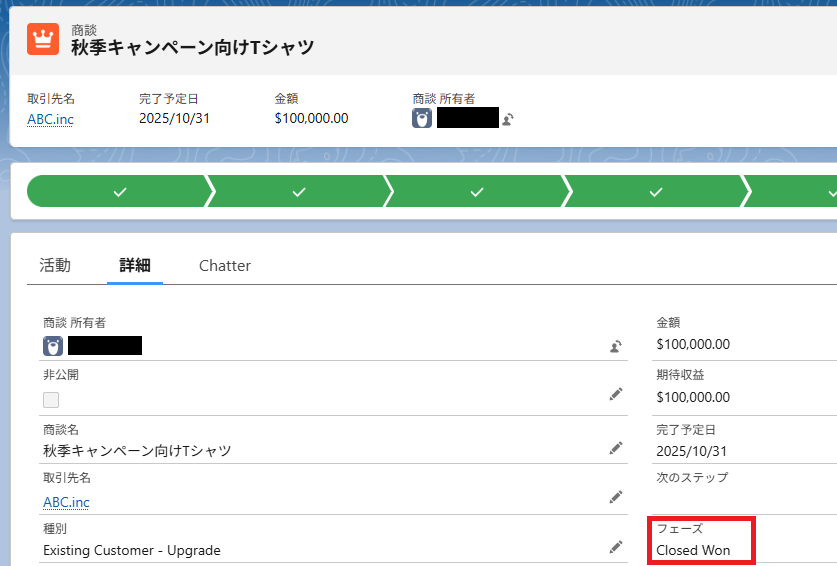 今回は商談が成立した際に更新されるフローを作成するので、以下のテストデータのフェーズを「商談成立(Closed Won)」に更新しました。