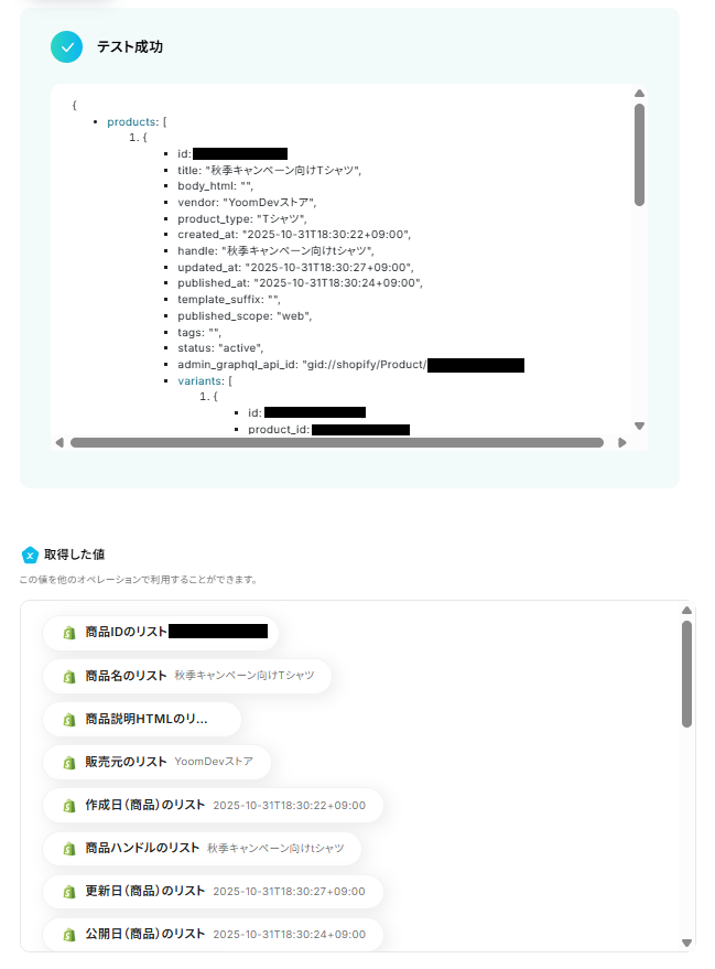 テストが成功すると、下記のような取得した値が表示されるはずです。