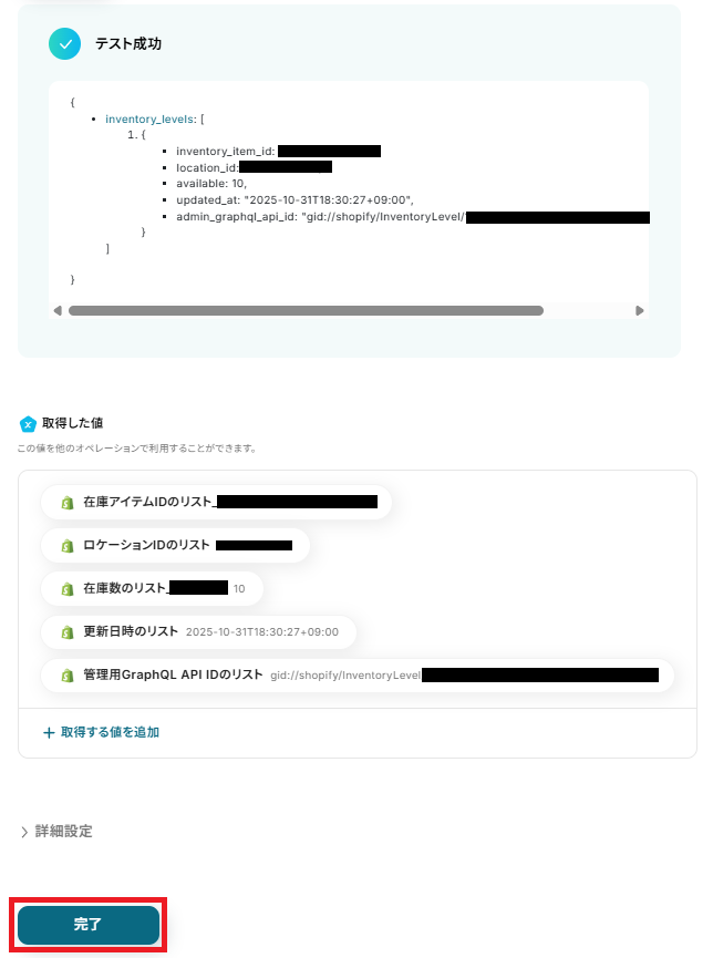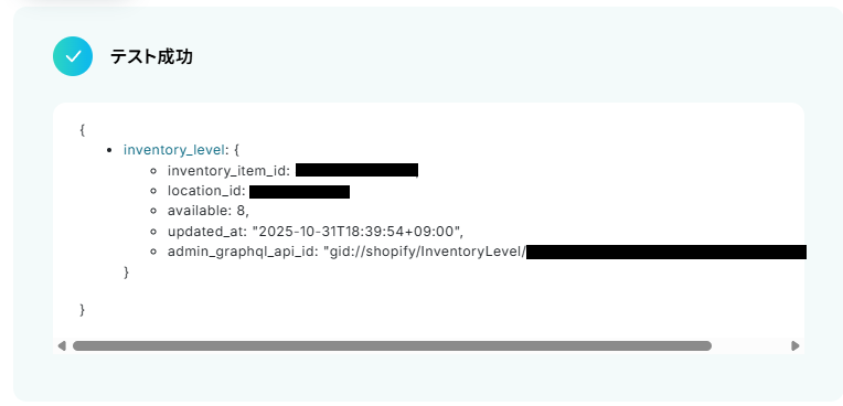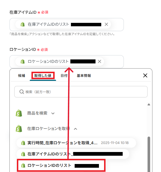 「在庫アイテムID」と「ロケーションID」を取得した値から設定しましょう。