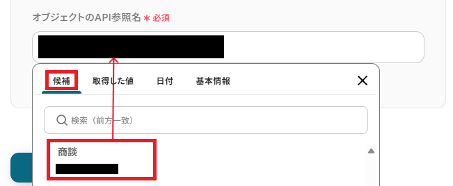 「オブジェクトのAPI参照名」は、入力欄をクリックして表示される候補から選択してください。