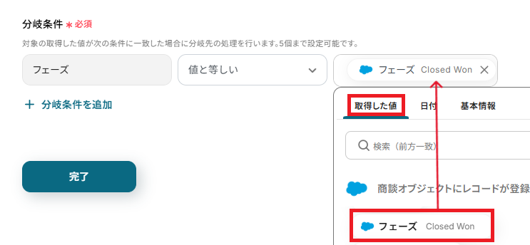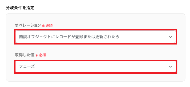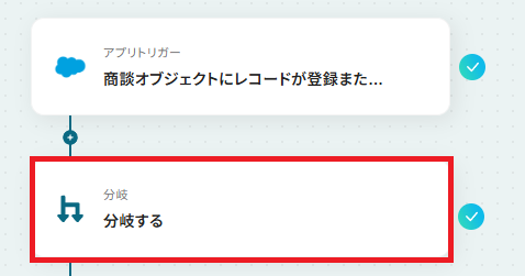 商談が成立した場合だけ処理を進めるよう、分岐条件を指定していきます。