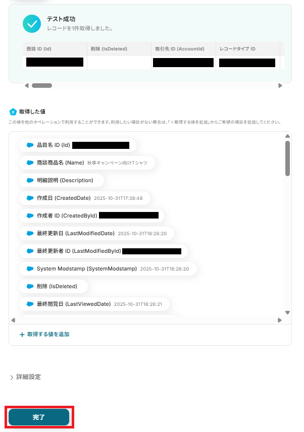 今回は【商談】のレコードを取得するので、以下のように設定します。