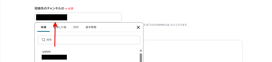 投稿先のチャンネルIDには下記画面のように、表示される候補から選択し入力してください。