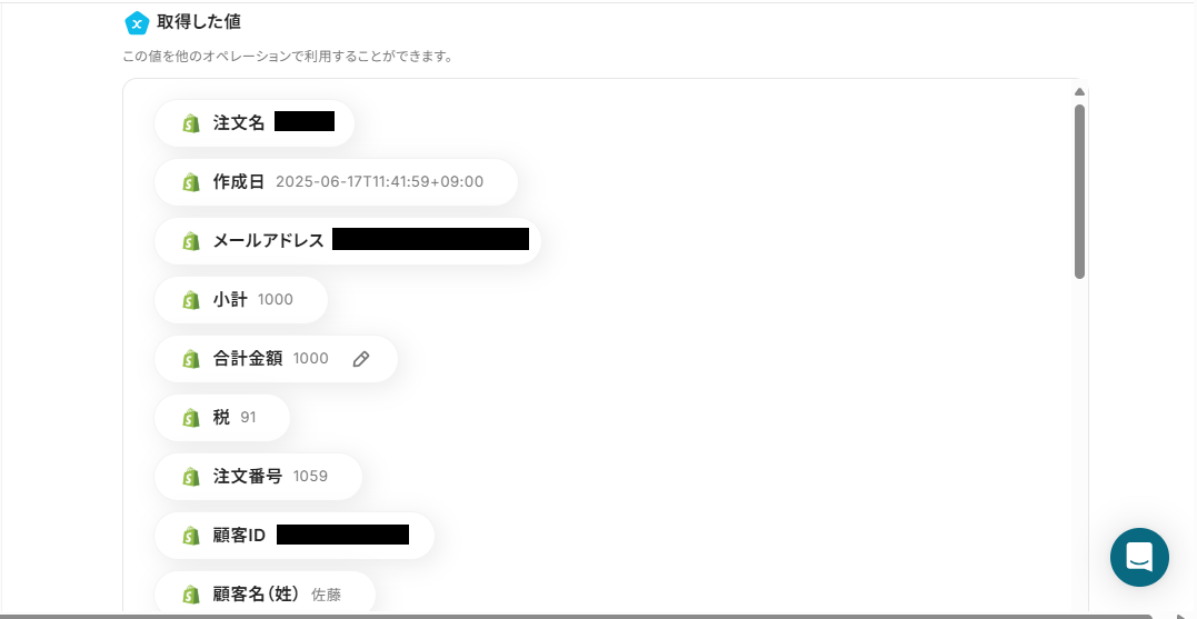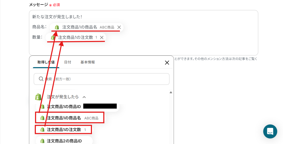 例えば、下記画面のように設定するとShopifyに新規注文が発生したら「注文商品の商品名」と「注文商品の注文数」を自動で取得しSlackに通知することが可能です!