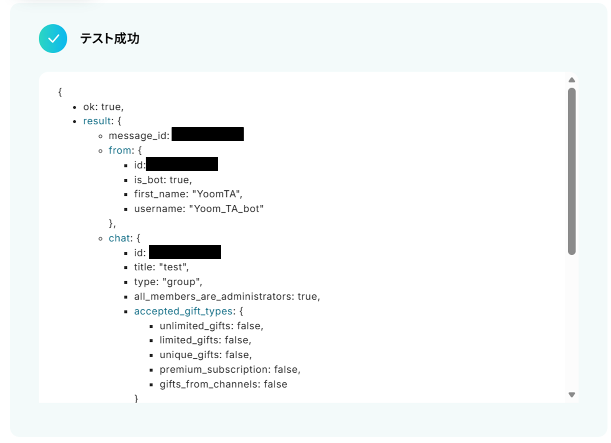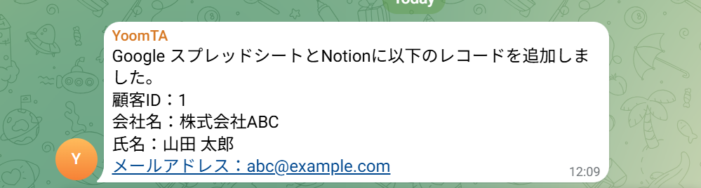 テストに成功すると、TelegramにGoogle スプレッドシートの情報が送信されました!