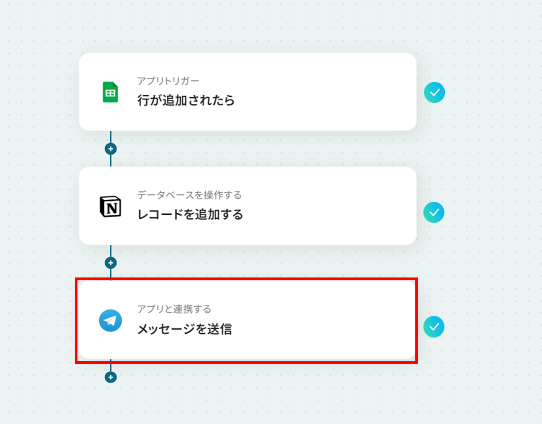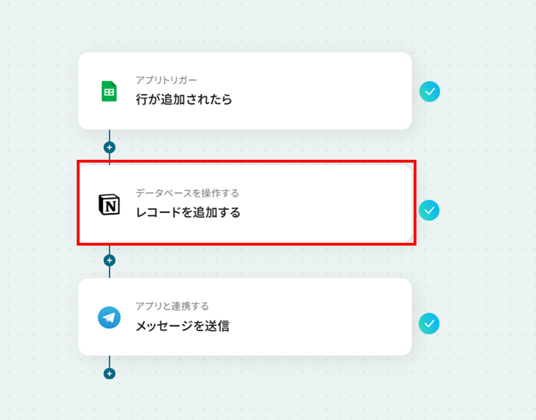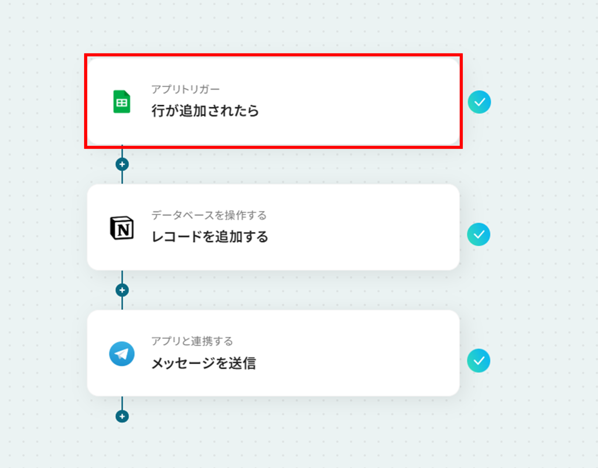 フローの作成方法 今回は、「Google スプレッドシートに、リード情報が追加されたら、Notionにレコードを追加し、Telegramに通知する」 フローを作成していきます!作成の流れは大きく分けて以下です。