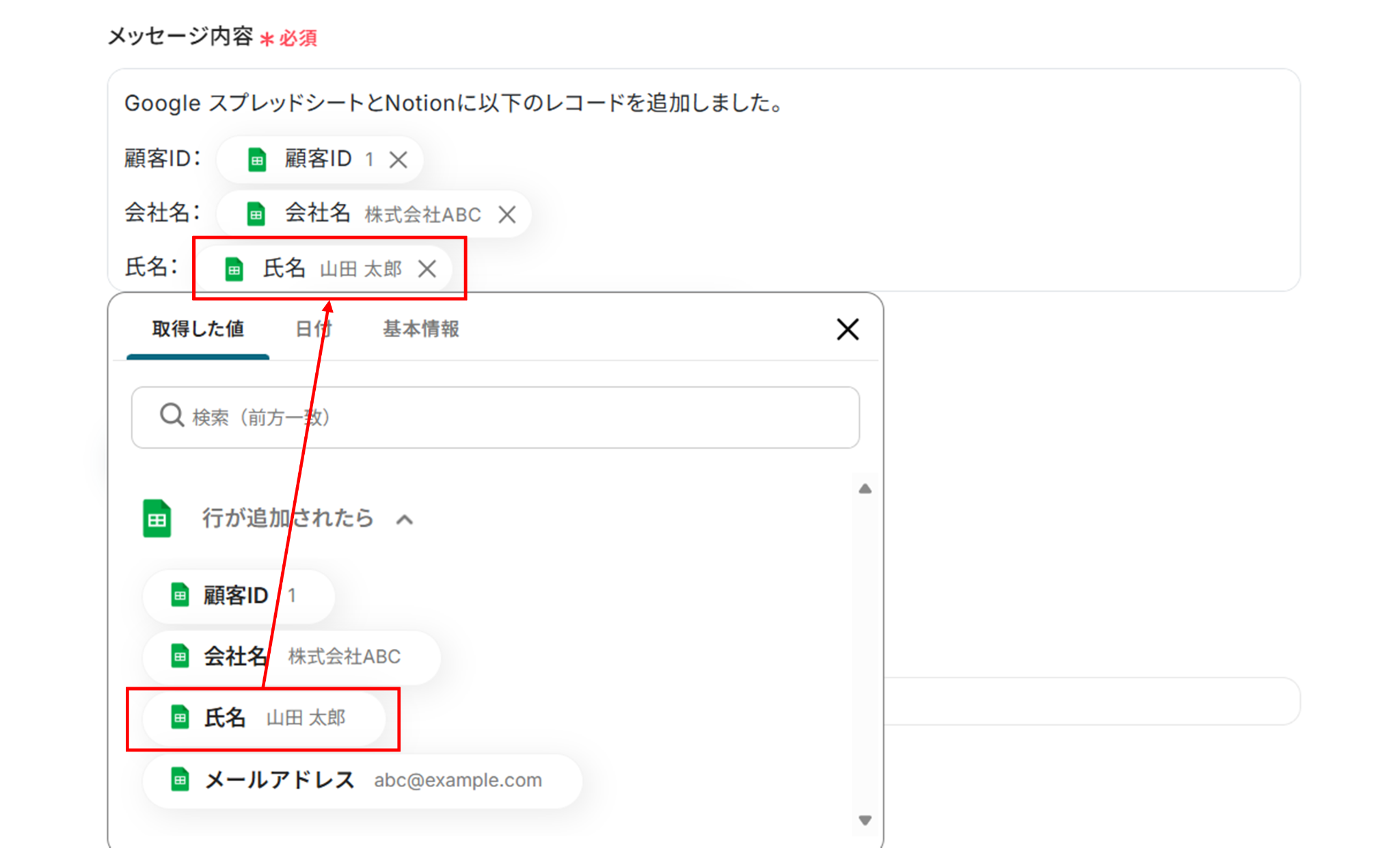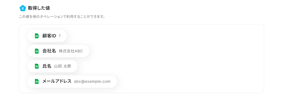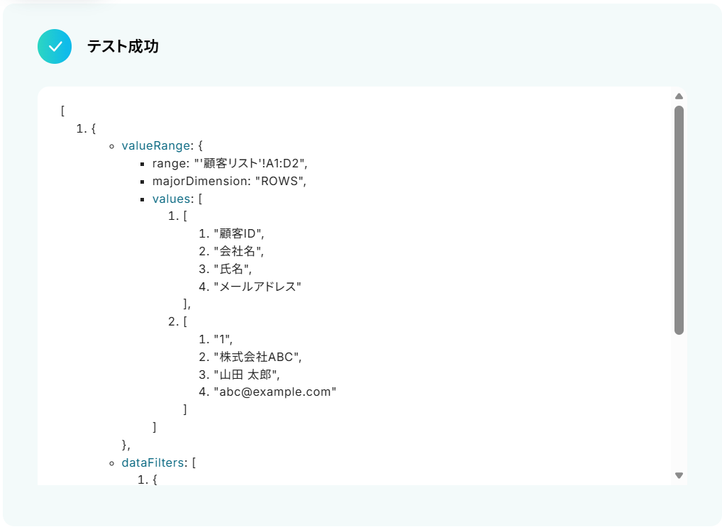 テストに成功すると、取得した値にGoogle スプレッドシートの情報が反映されます。 「取得した値ってなんだろう?」と思った方は下のサイトをご参照ください。