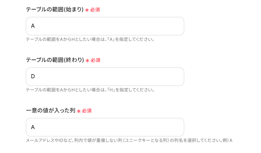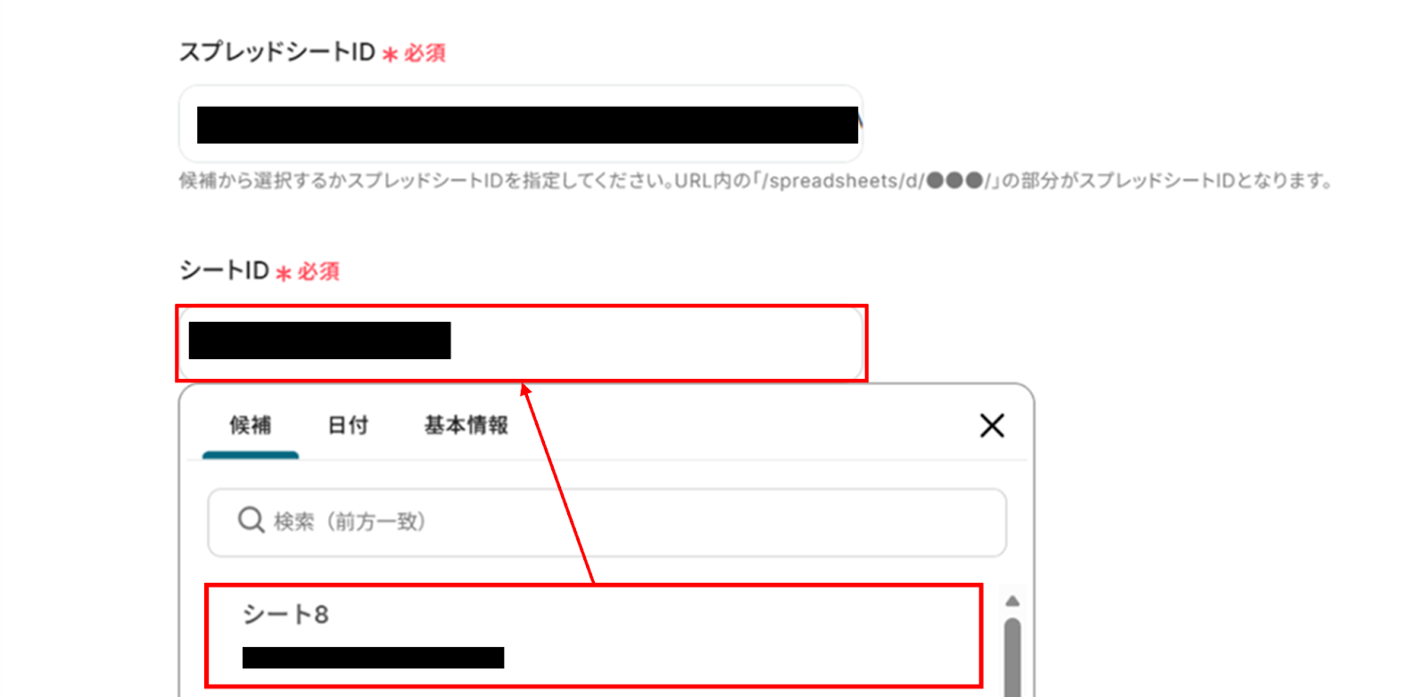 下へ進み、スプレッドシートIDとシートIDは候補から選択します。