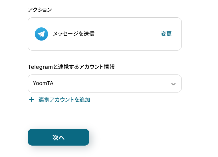 (2)「連携アカウントとアクションを選択」画面から、Telegramと連携するアカウント情報に誤りがないかを確認し、アクションは「メッセージを送信」のままで「次へ」をクリックしましょう。