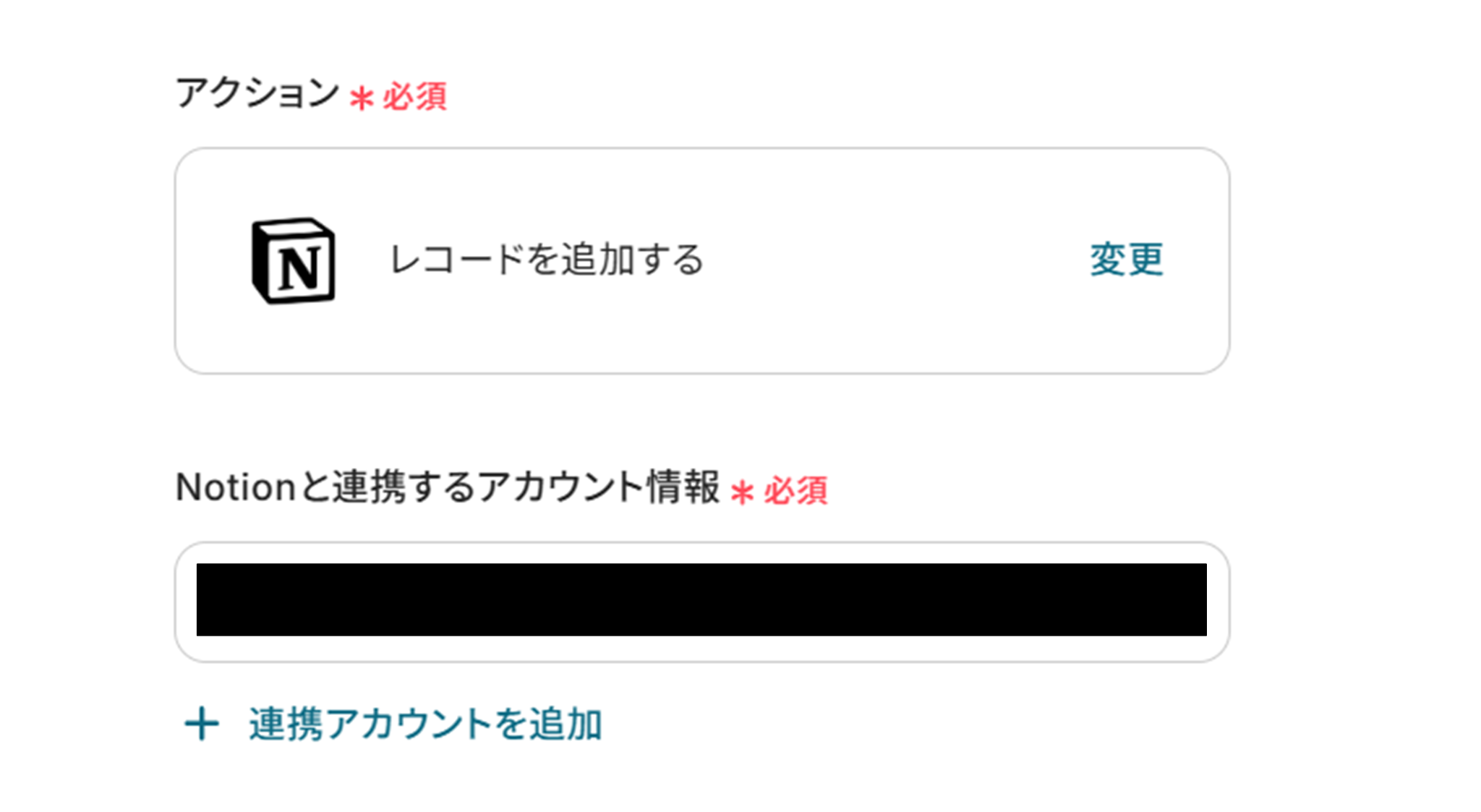 (2)「連携アカウントとアクションを選択」画面から、Notionと連携するアカウント情報に誤りがないかを確認し、アクションは「レコードを追加する」のままにします。