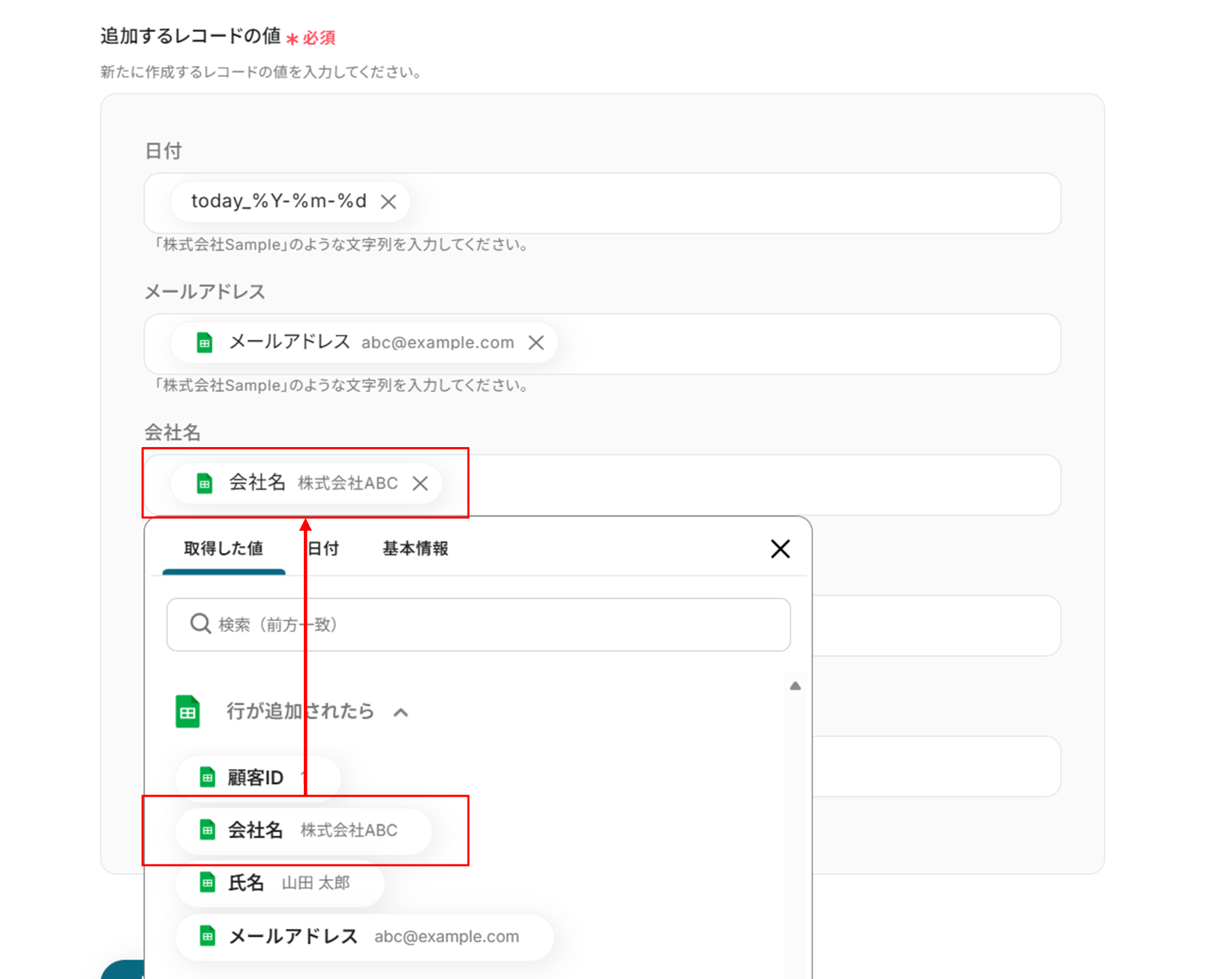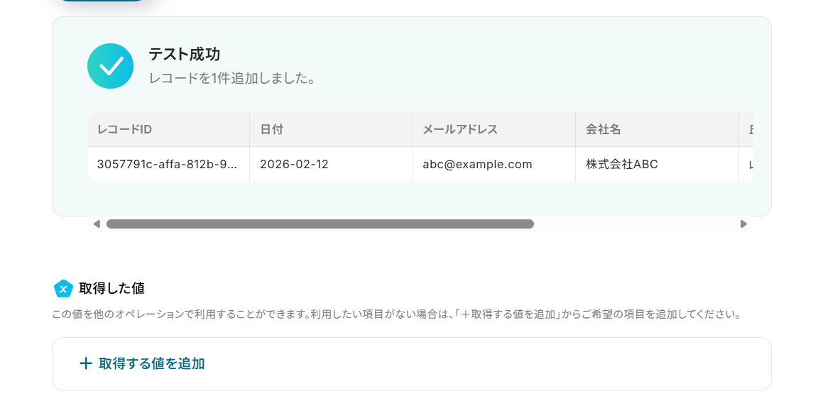 (3)「追加するレコードの値」に先ほど取得した値を使って入力します。 取得した値を使って入力することで、都度変更することなく最新の情報を反映することができます! 入力が終わったら「テスト」をクリックしましょう。