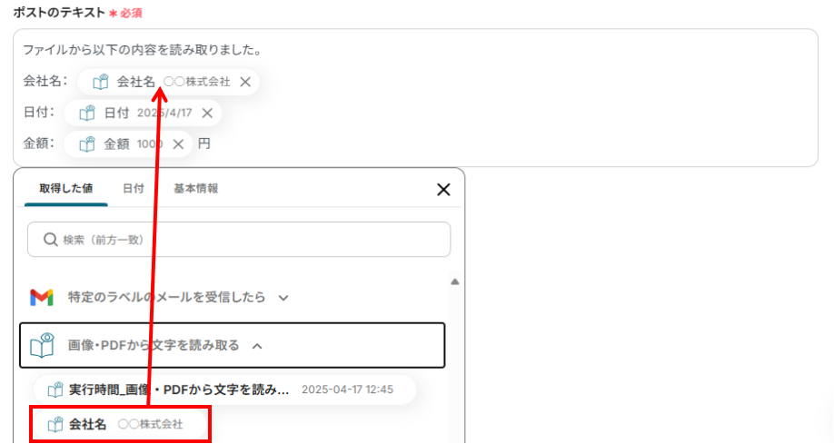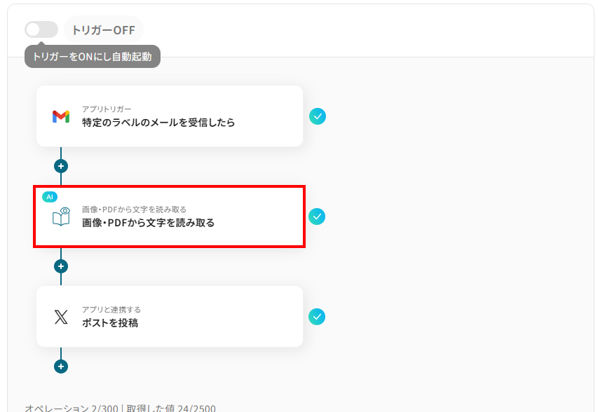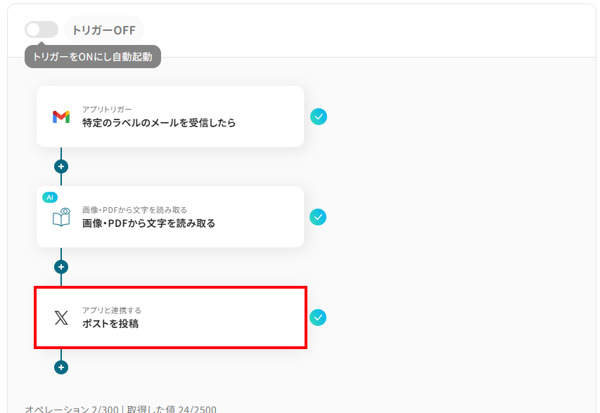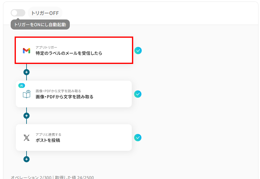 ここでは代表的な例として、Gmailに届いたメールの添付ファイルをOCRで読み取り、そのテキストデータをX(Twitter)へ自動投稿するフローの作成手順を解説します。
