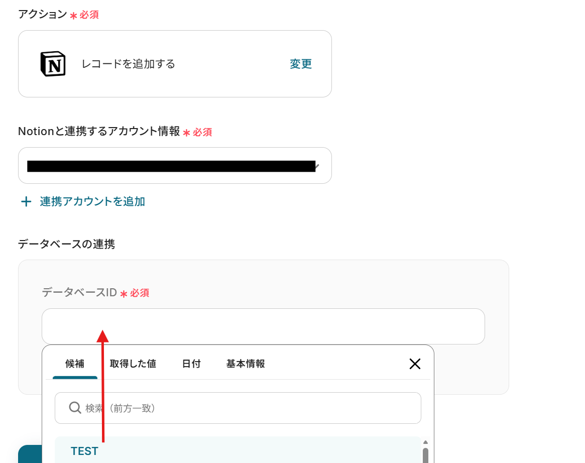 データベースIDは候補から先ほど作成したものを選択します。