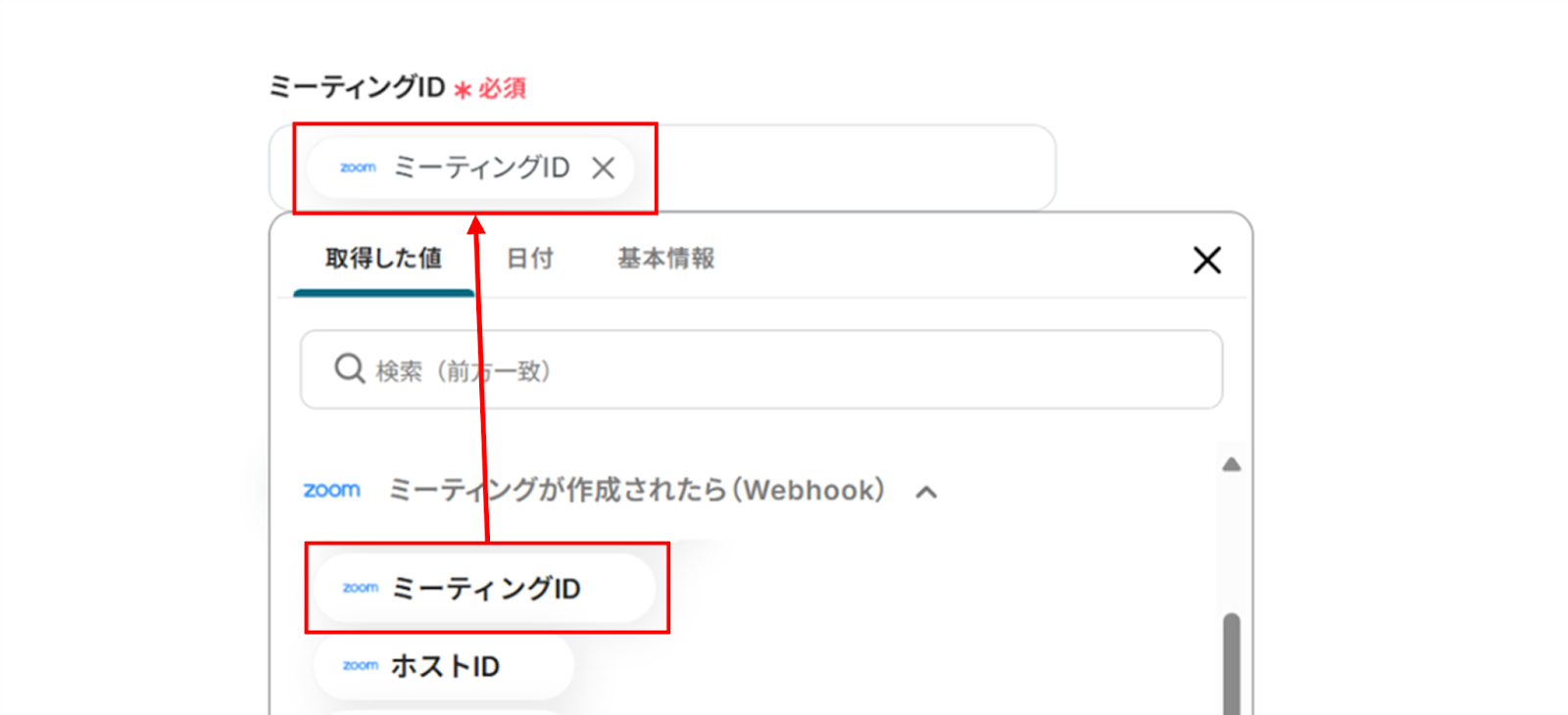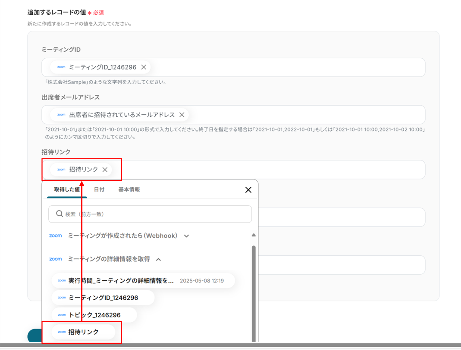 (1)次に、Zoomと連携して、ミーティングの詳細情報を取得します。