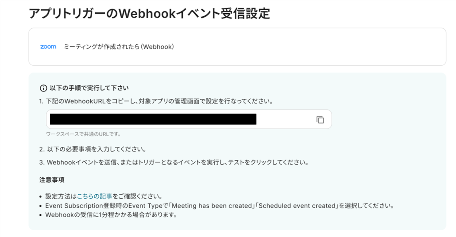(3)「アプリトリガーのWebhookイベント受信設定」画面から、WebhookURLをコピーし、Zoomの管理画面で設定を行なってください。