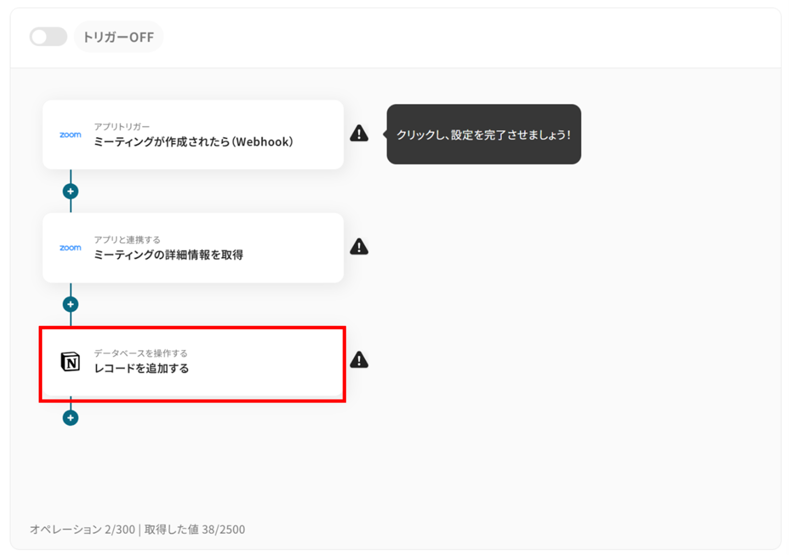 それではここから代表的な例として、Zoomで新しいミーティングが作成された際に、その情報をNotionのデータベースに自動でアイテムとして追加するフローを解説していきます!