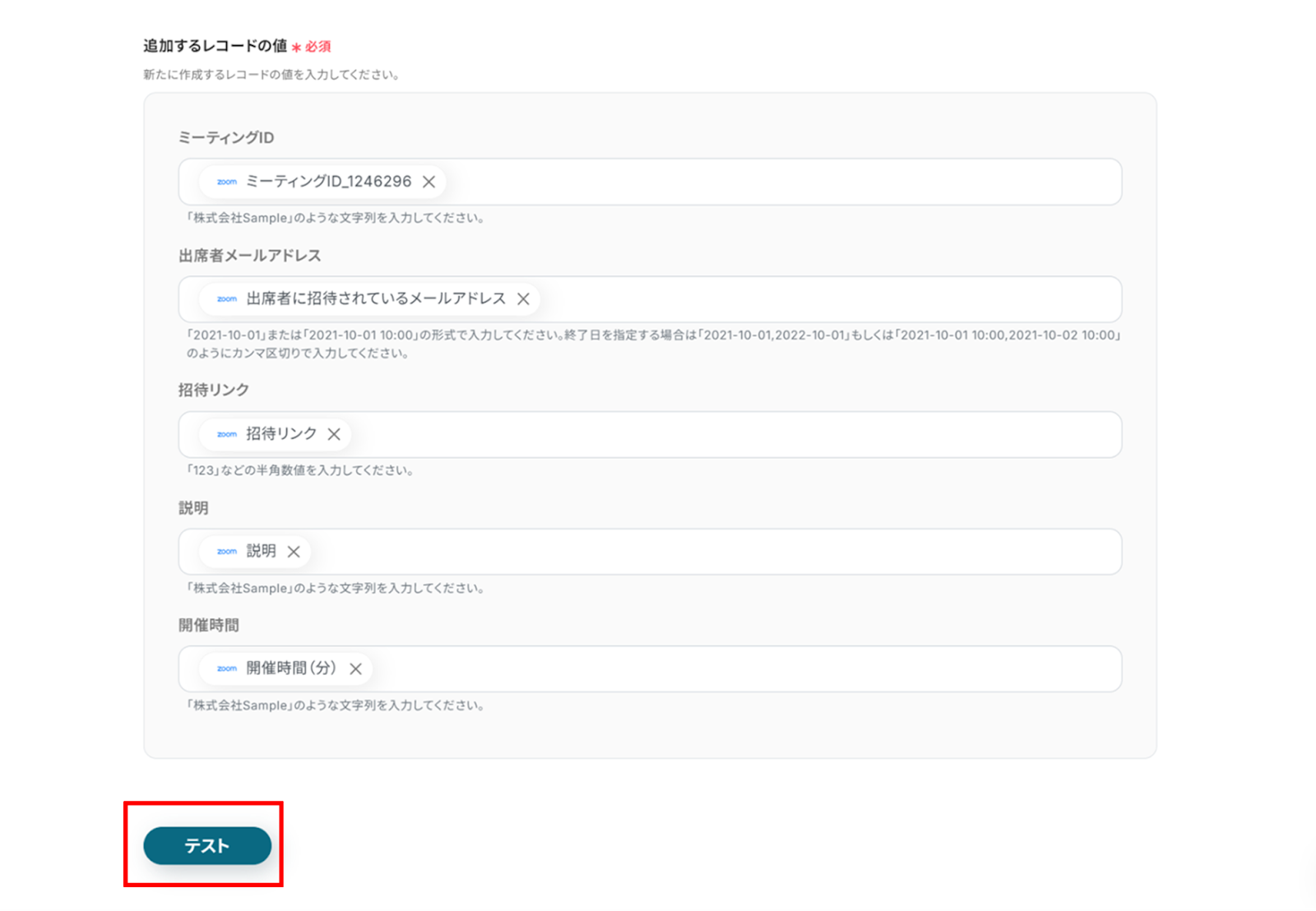 「取得した値」にZoomの情報が反映されればテスト成功です。