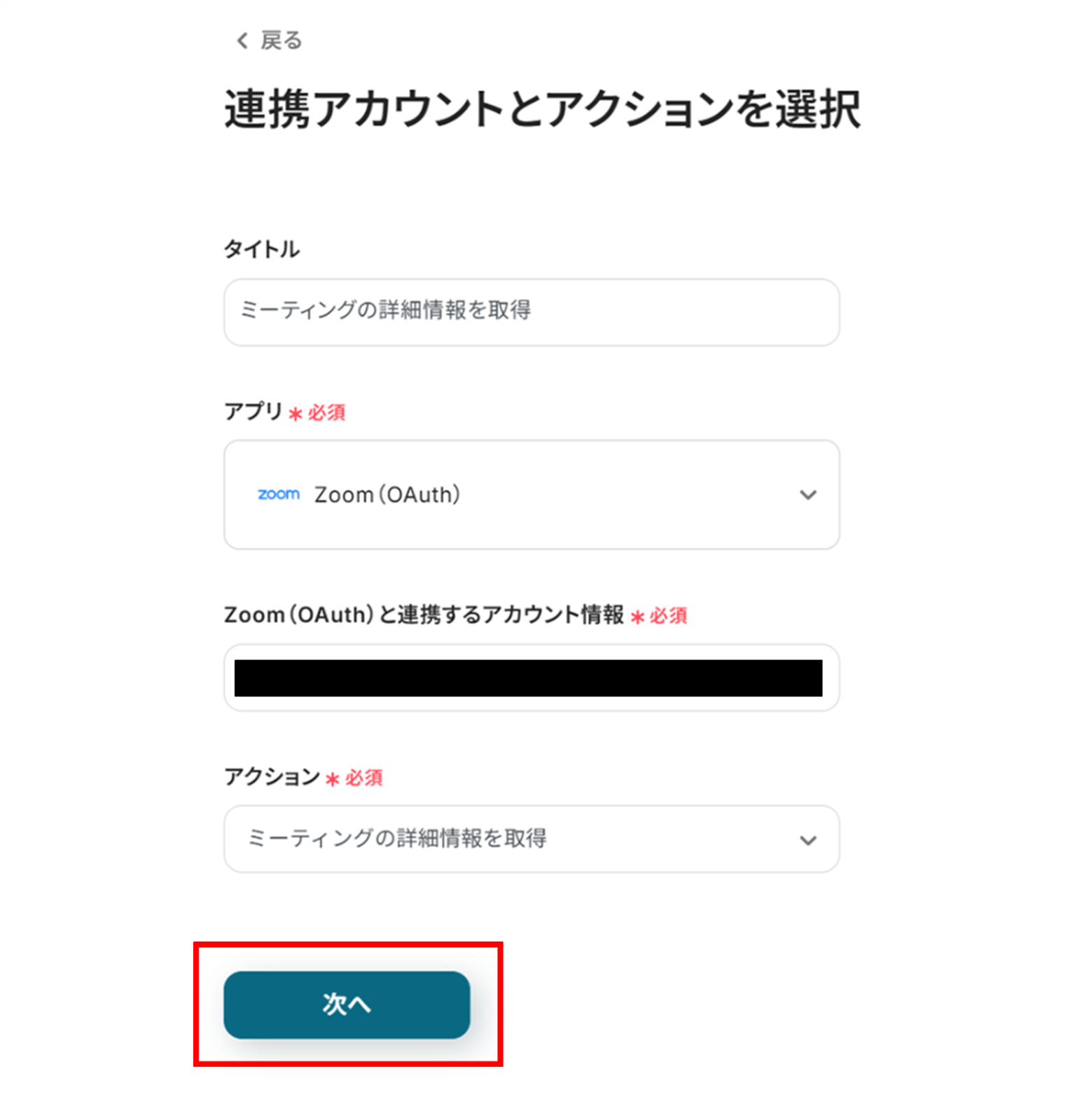 (2)タイトルと連携するアカウント情報を任意で設定し、アクションはテンプレート通りのまま「次へ」をクリックして進んでください。