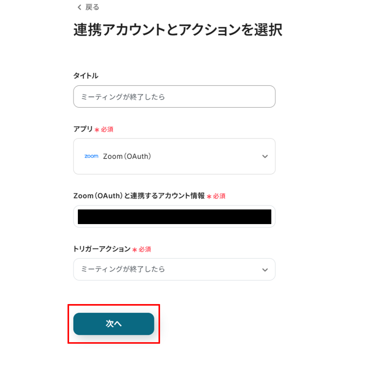 Zoomの「連携アカウントとアクションを選択」画面から、Zoom(OAuth)と連携するアカウント情報に誤りがないかを確認し、トリガーアクションは「ミーティングが終了したら」のままで「次へ」をクリックします。