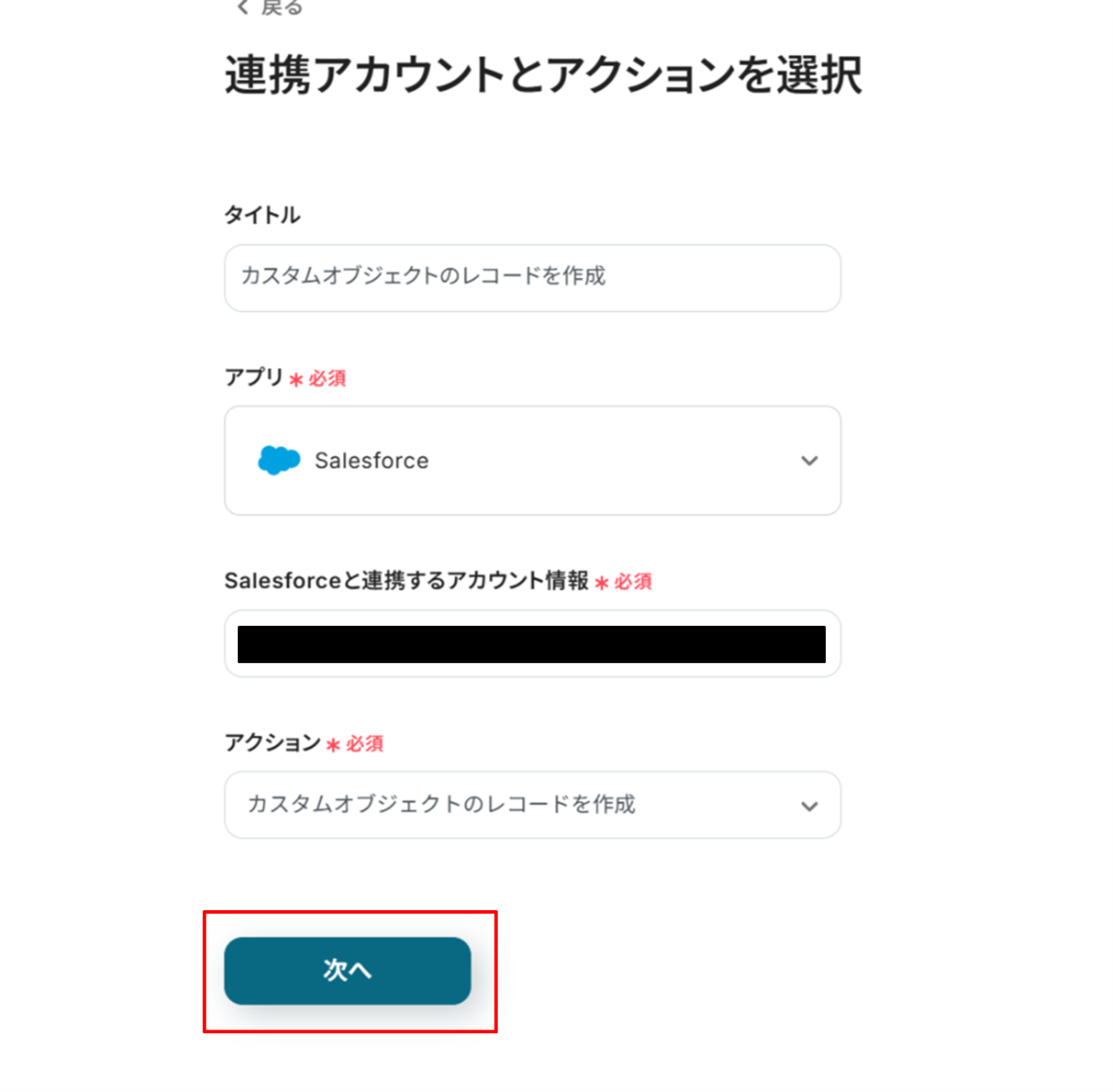 (2)Salesforcetの「連携アカウントとアクションを選択」画面から、Salesforceと連携するアカウント情報に誤りがないかを確認し、アクションは「カスタムオブジェクトのレコードを作成」のままで「次へ」をクリックします。