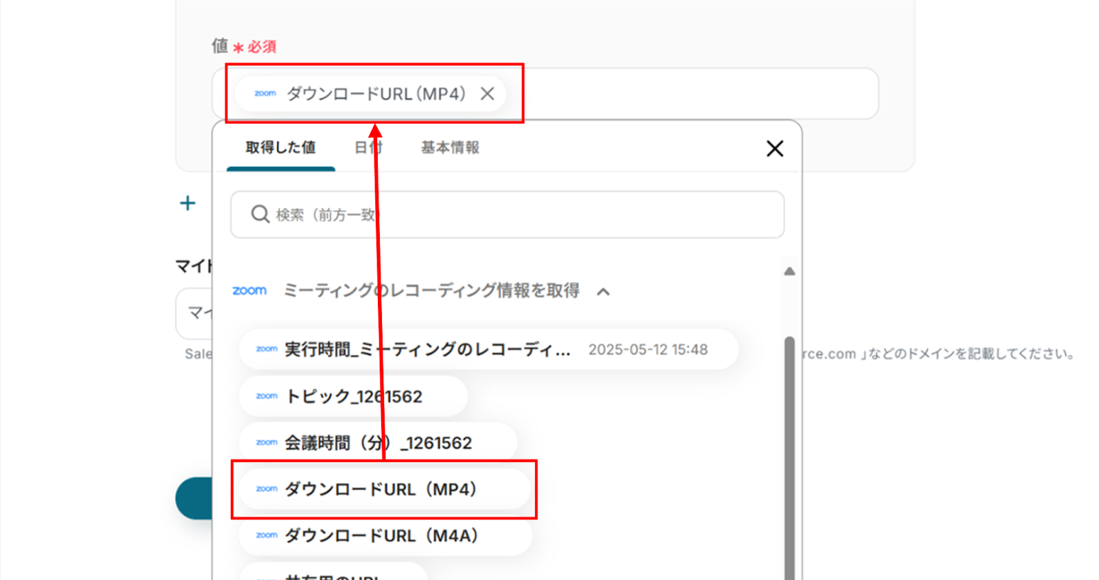 テストが成功すると、「取得した値」にZoomのレコーディング情報が追加されます。