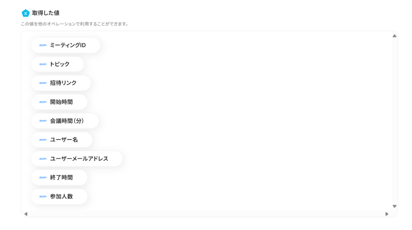 テストが成功すると、「取得した値」にZoomのレコーディング情報が追加されます。