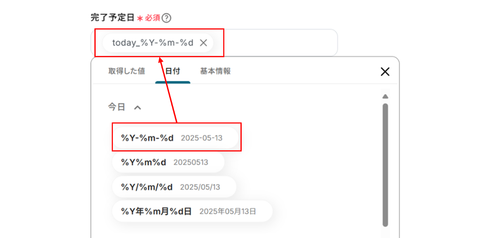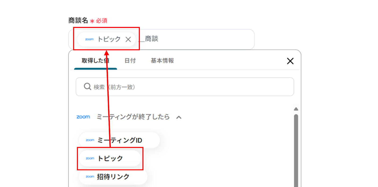 (3)「API接続設定」画面から、商談名を取得した値を使って入力します。