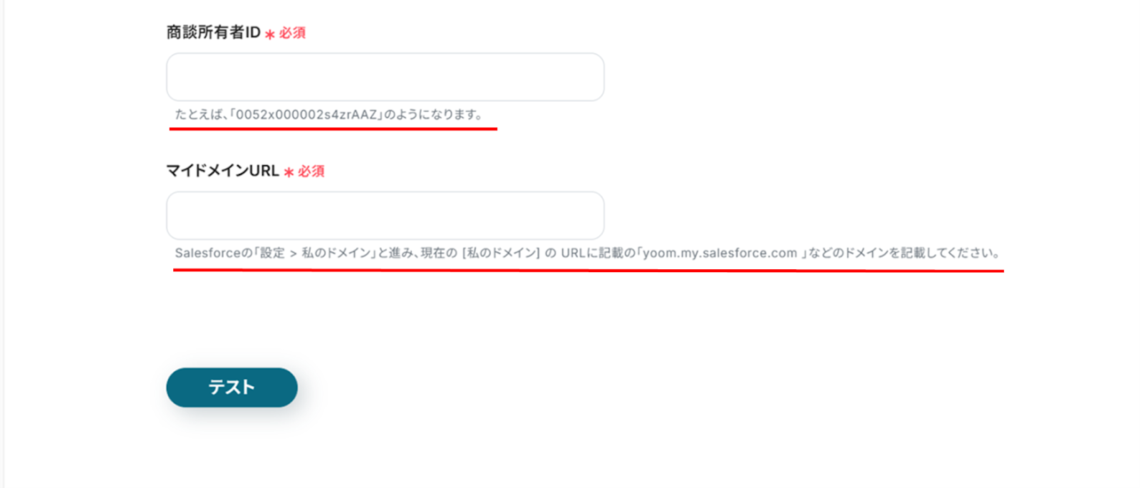 商談所有者IDとマイドメインURLは赤線を確認の上、直接入力を行ってください。