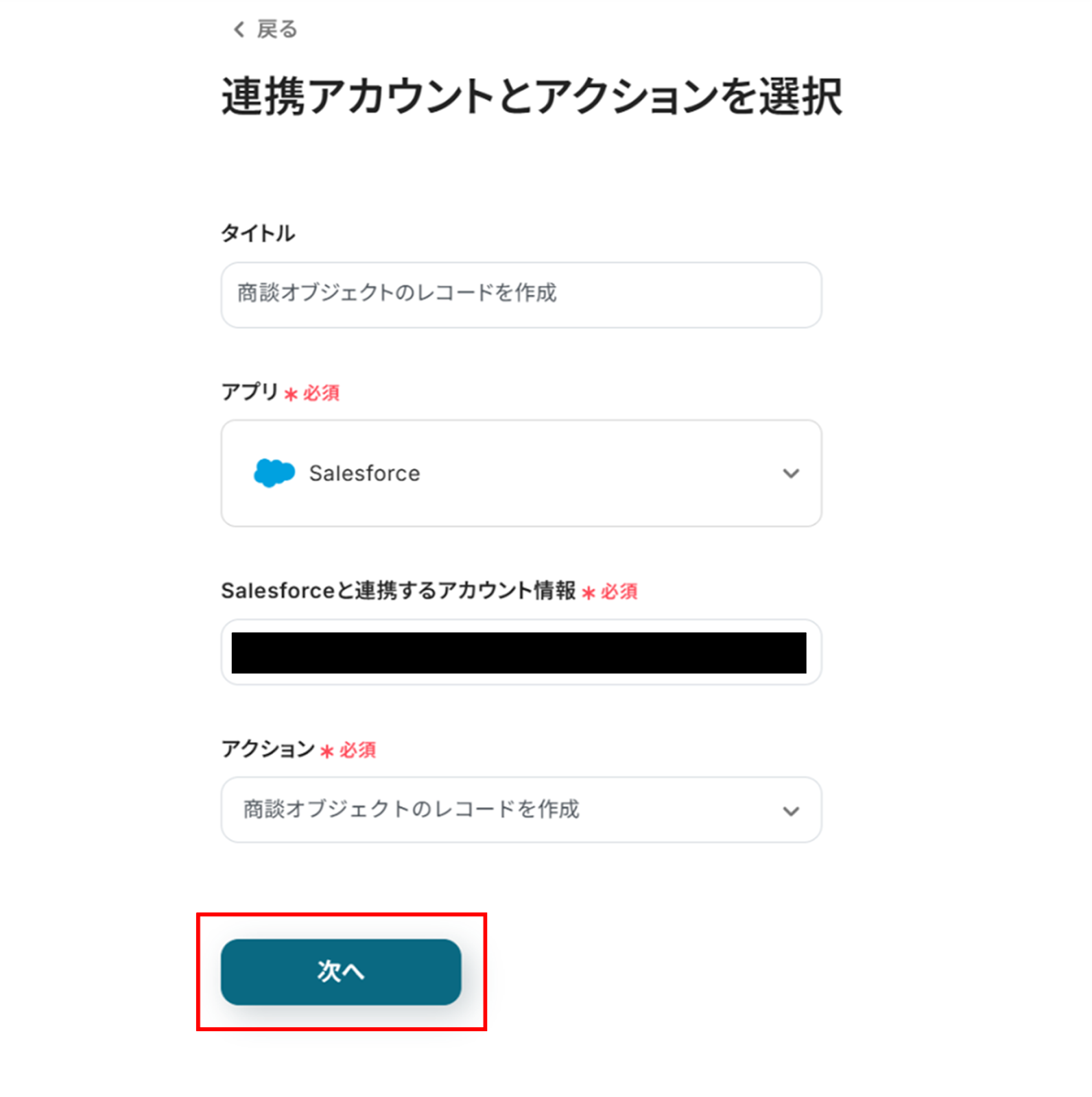 (2)Salesforceの「連携アカウントとアクションを選択」画面から、Salesforceと連携するアカウント情報に誤りがないかを確認し、アクションは「商談オブジェクトのレコードを作成」のままで「次へ」をクリックします。