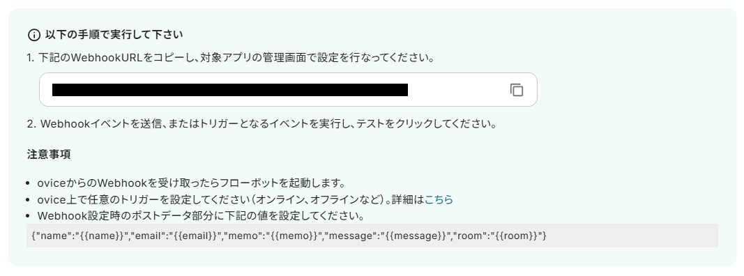 URLをコピーしたら、oviceの画面でWebhookトリガー設定を行います。設定可能なトリガーは、こちらをご参照ください。
