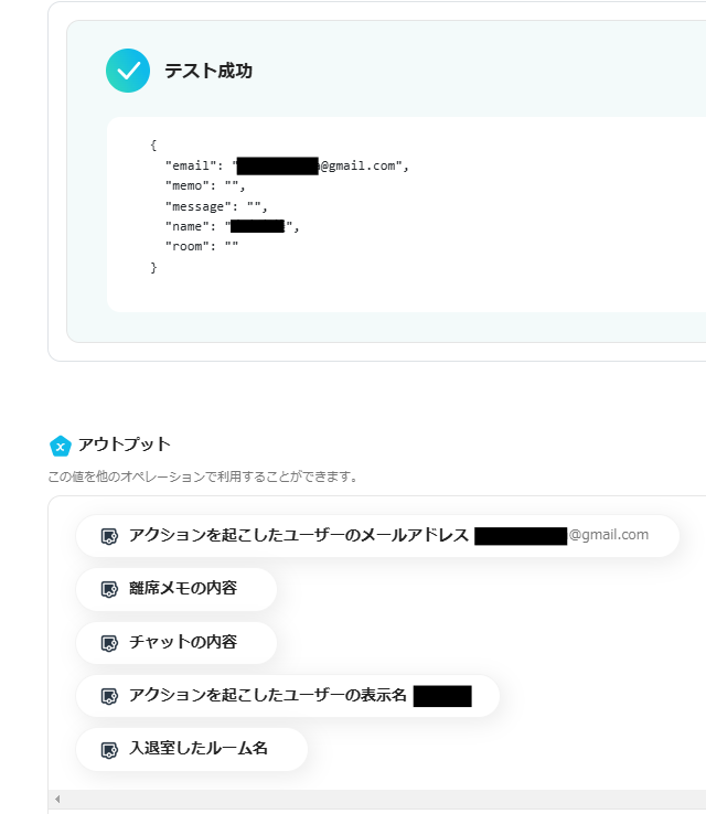 アウトプットとは、トリガーやオペレーション設定時に、「テスト」を実行して取得した値のことを指します。