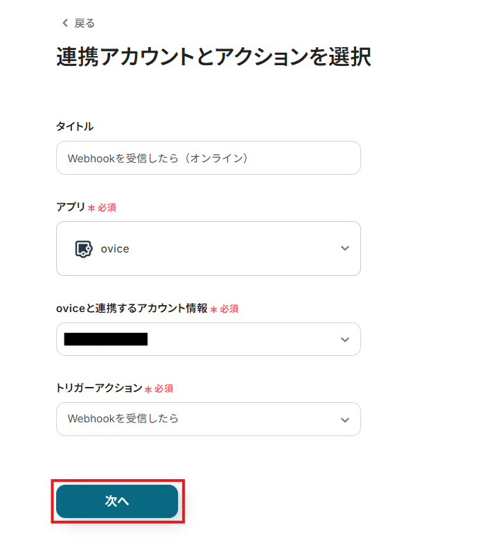 連携するアカウント情報には、ステップ1で連携したアカウント情報が反映されています。トリガーアクションはそのままにして、「次へ」をクリックしてください。
