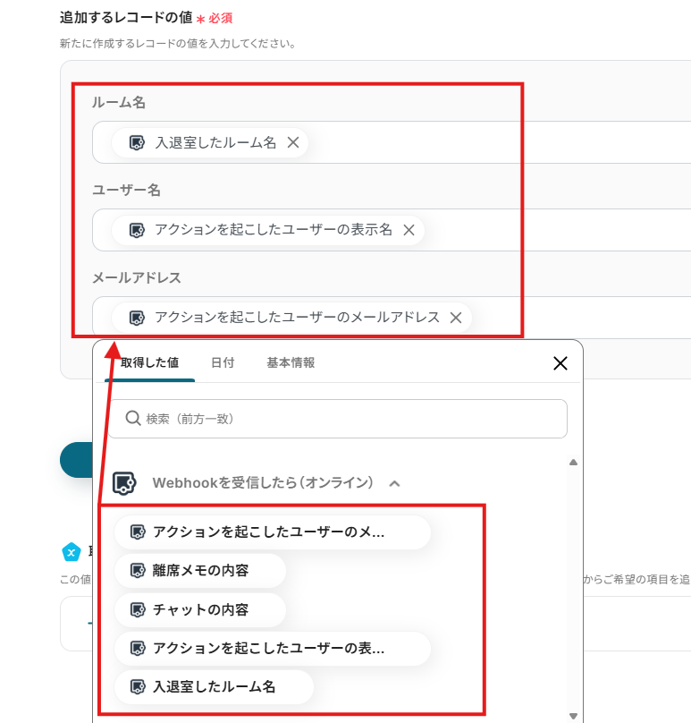 「追加するレコードの値」の各項目は、入力欄をクリックして表示されるアウトプット(取得した値)から選択してください。