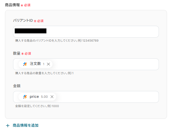 バリアントIDはShopifyの商品のバリアントIDを固定値で入力してください。
