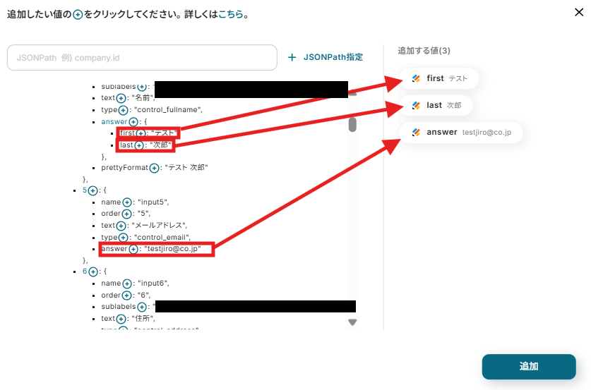 なお、すべての値が取得できる訳ではないため、取得したい最新の回答をJSONPATHを使用して追加します。