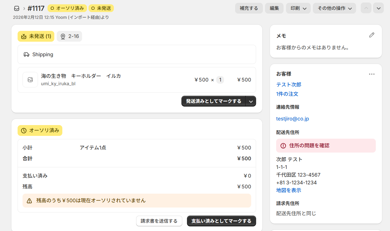 テストが成功したら、Shopify側で注文が作成されているか確認してください。