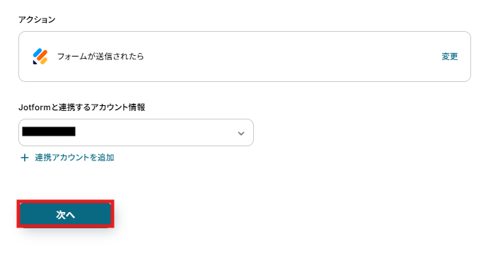 アクションは変更せず、アカウント情報がマイアプリ連携をしたアカウントと一致することを確認したら、「次へ」をクリック。