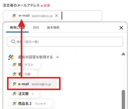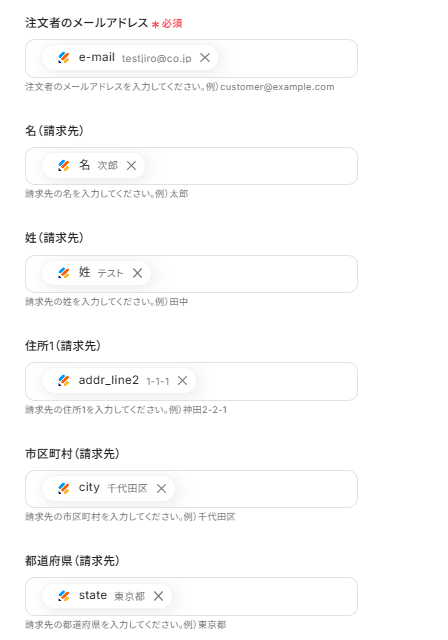 - Shopifyのオペレーション設定では、連携したいJotformの回答項目(顧客情報や注文数など)を任意にマッピングして設定してください。