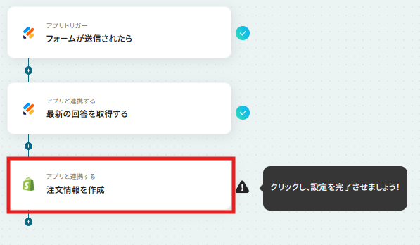 - 最後に、オペレーションでShopifyの「注文情報を作成」アクションを設定し、取得したフォーム情報を連携する。