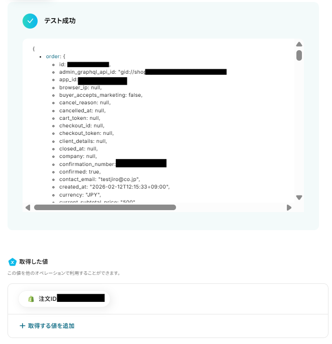 テストに成功すると、「取得した値」に情報が追加されます。