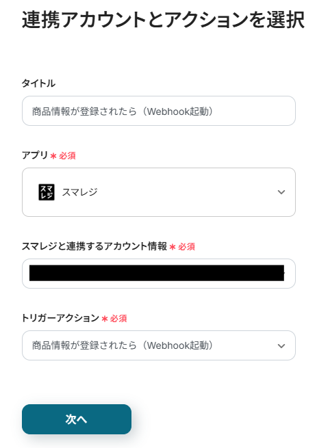 タイトルと連携するアカウント情報を任意で設定し、トリガーアクションはテンプレート通りに「商品情報が登録されたら(Webhook起動)」のまま「次へ」をクリックして進んでください。