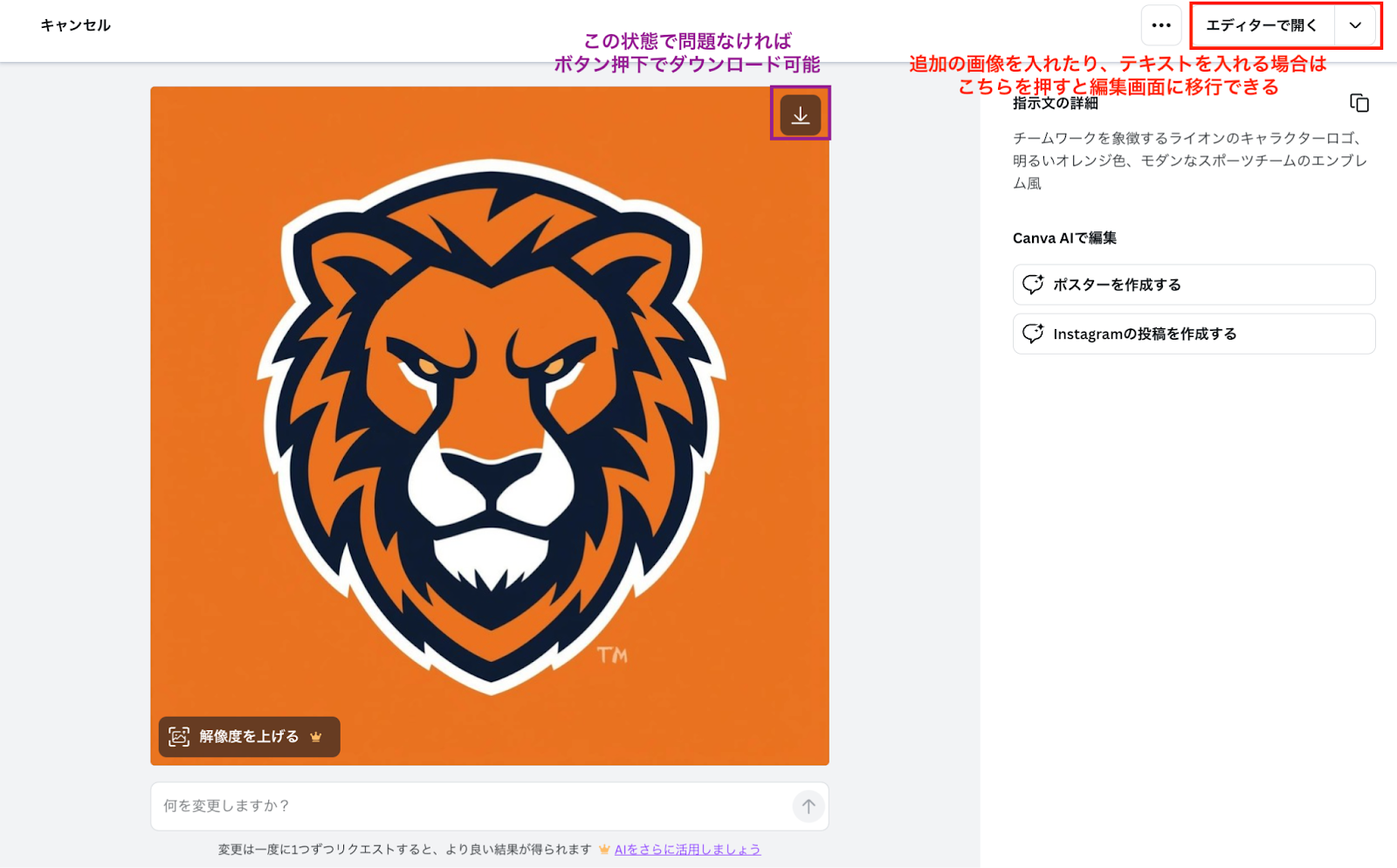 ユーザーがテキストで指示(プロンプト)を入力するだけで、独創的なイラストやアイコンが数秒〜数十秒で生成でき、生成した画像はそのままCanvaのエディタ上で編集・加工ができます。(簡単な会話で、コンセプトの構築からデザイン完成までが実現するなんてすごい!)