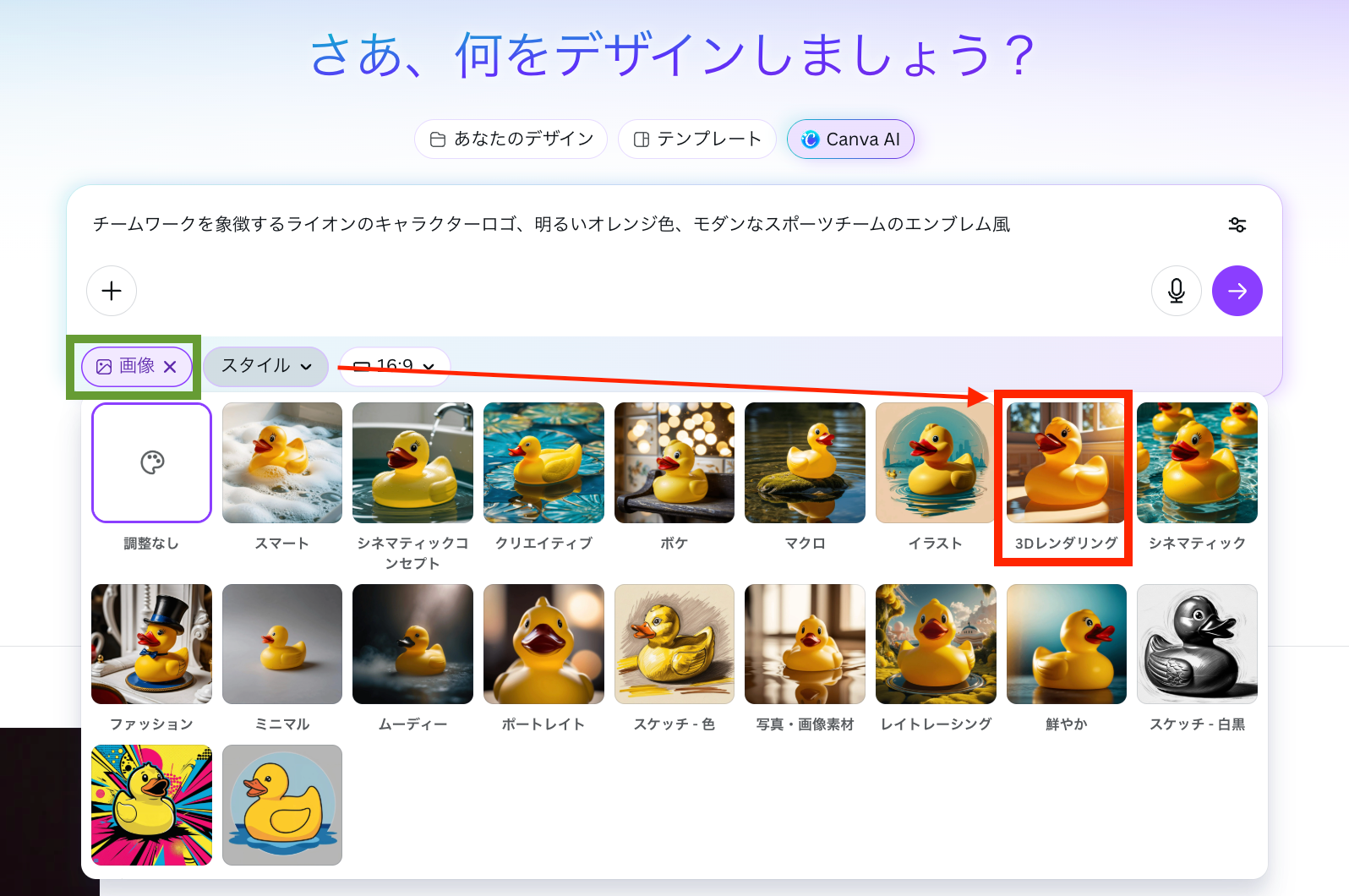 今回は、以下のような設定でAIに画像を生成してもらいましょう。(『画像』を指定、『スタイル』は3Dレンダリングを選択)