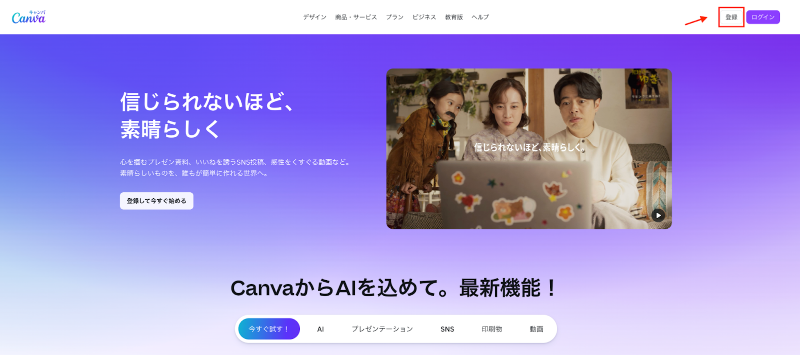 Canvaのサイトにアクセスして、サイトページの右上『登録』を押下します。