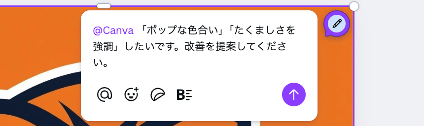 生成画像の編集画面でもCanva AIの機能が随所に活かされています。例えば、画像を選択した状態で「Canva AIに聞く」をクリックすると、チャット画面が右側に表示されます。