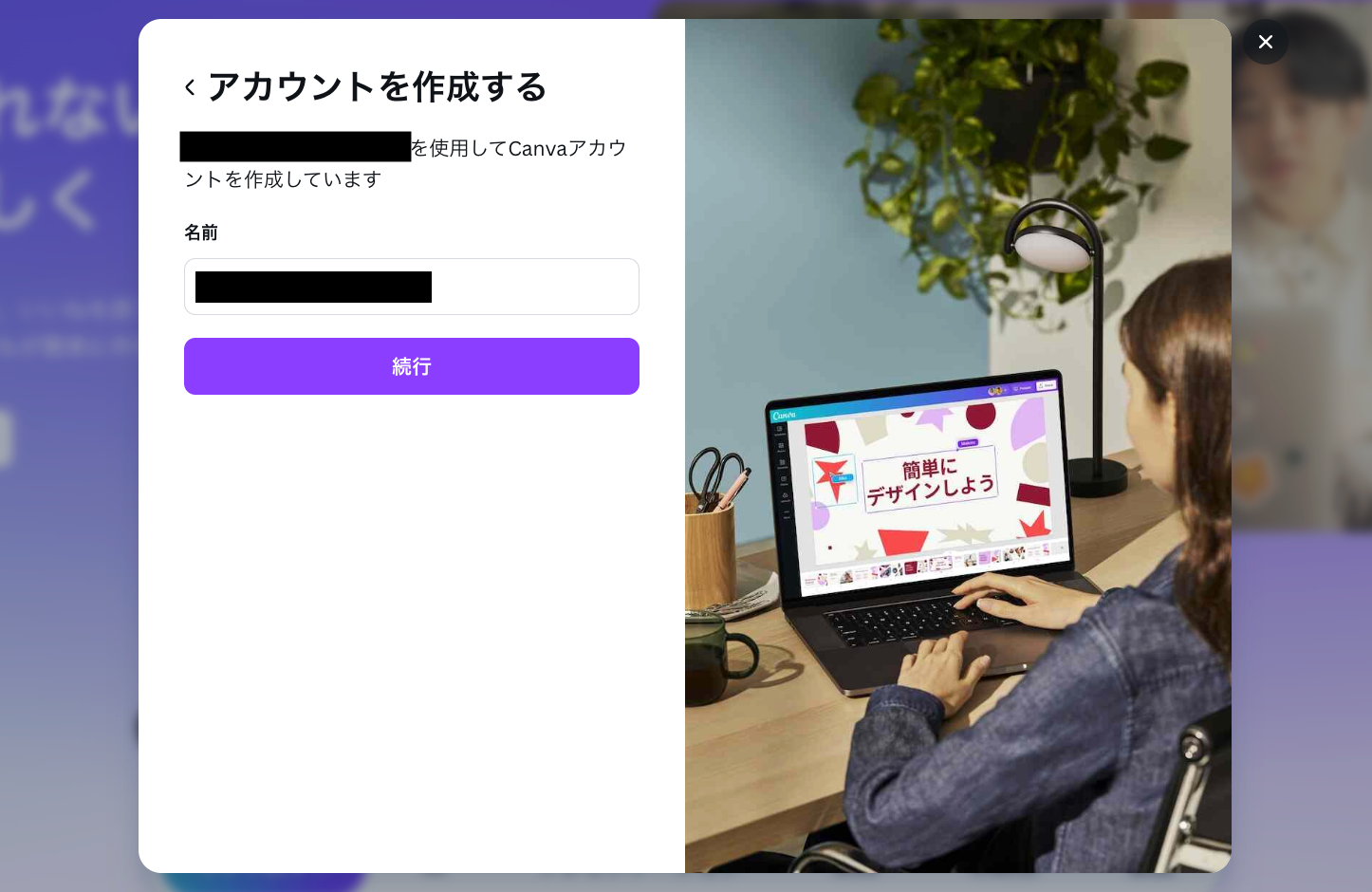 メールアドレスによるアカウント作成を選択すると、メールアドレスの入力とCanvaのアカウント名の入力が求められます。