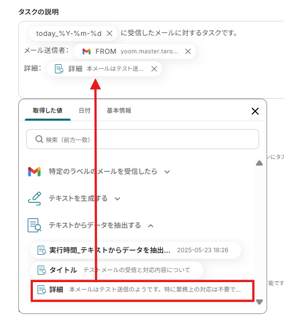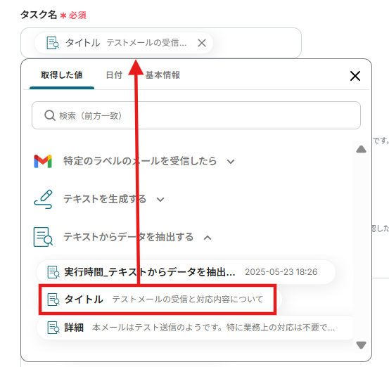 3.「タスク名」は入力欄をクリックし、先ほど取得したアウトプットから選択します。
