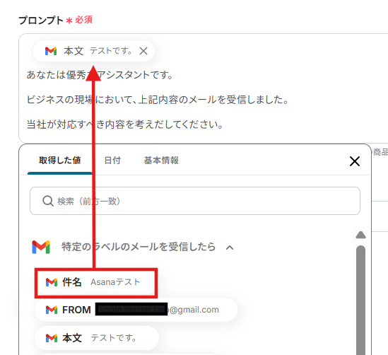 3.プロンプトにはAIに指示するため、トリガー設定で取得したアウトプットと任意の内容を入力します。