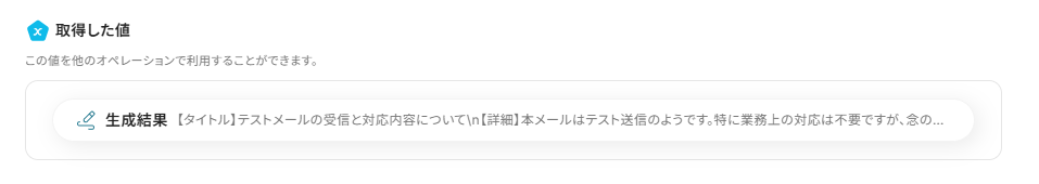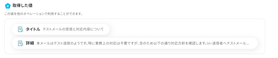 テストが成功した場合は、先ほどの様にアウトプットが表示されます。 こちらも次の設定で活用するので、データを確認しましょう。