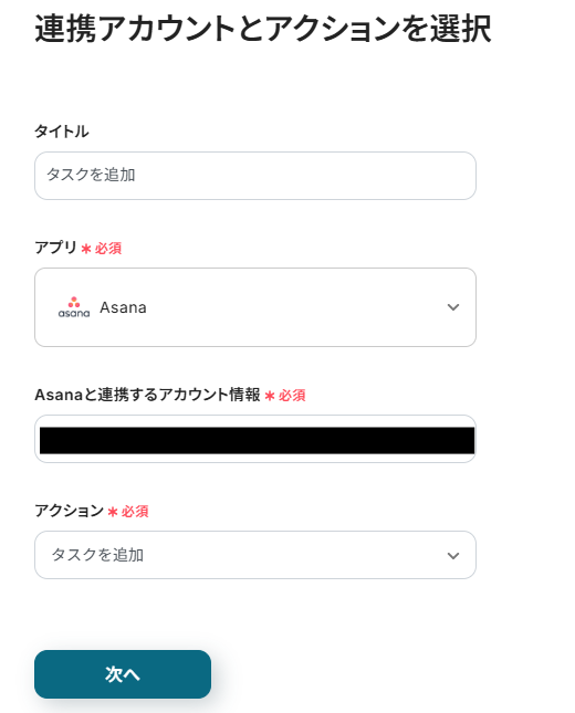 先ほどと同様にタイトルと連携するアカウント情報を任意で設定し、アクションはテンプレート通りに「タスクを追加」のまま「次へ」に進みます。